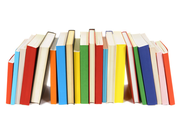 Long row of colorful library books isolated on white background